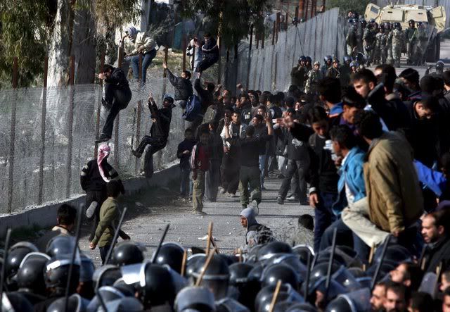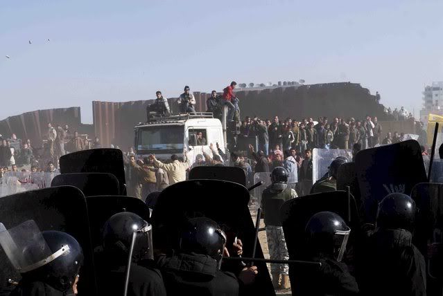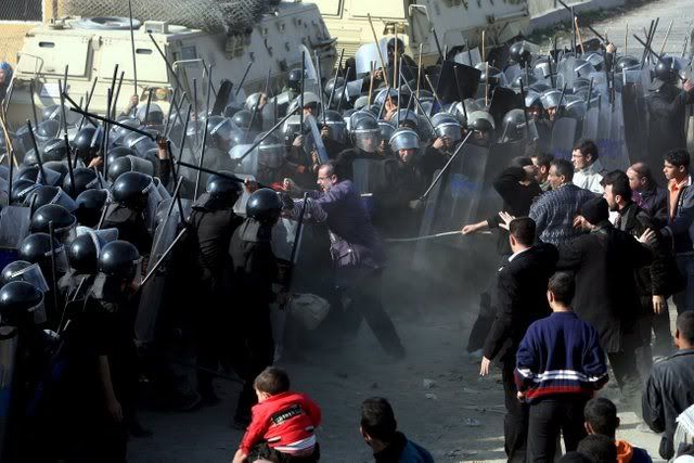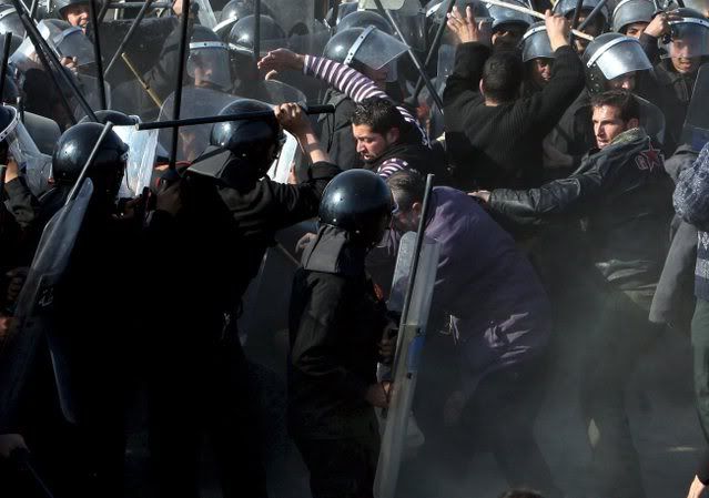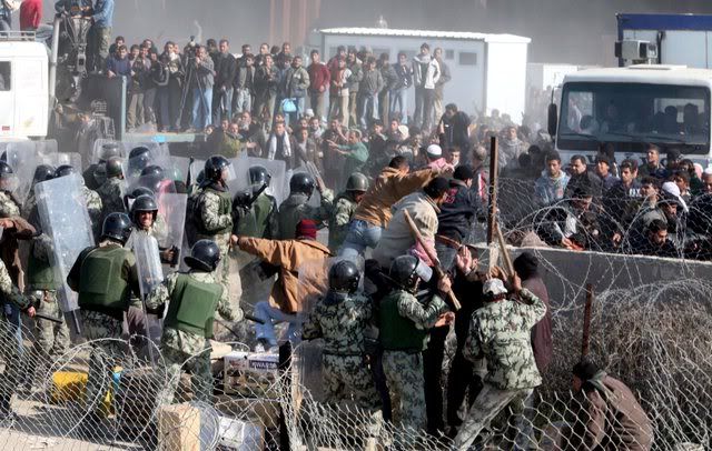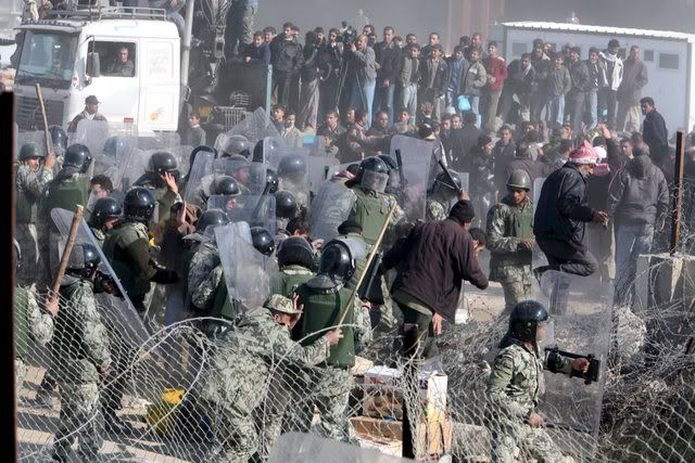 Egyptian border guards and riot police officers clash with Palestinians trying to cross the border after militants exploded the border wall between Gaza Strip and Egypt earlier this week, in Rafah, southern Gaza Strip, 25 January 2008