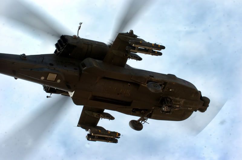 U.S. Army Apache helicopter provides air support for 3rd Squadron, 7th Cavalry, 3rd Infantry Division during a Squadron cordon and search mission in the Adhamiya District of Baghdad, Iraq, Nov. 17, 2007.
