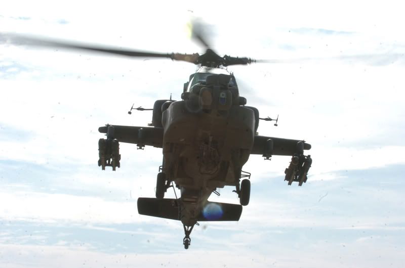 An AH-64 Apaches, belonging to the 1st Attack Reconnaissance Battalion, 1st Aviation Regiment, takes off from Forward Operating Base Warhorse, Iraq, Jan. 18. The Apache is stationed at Contingency Operating Base Speicher and is part of the Combat Aviation Brigade, 1st Infantry Division, which is in charge of all aviation assets in northern Iraq.