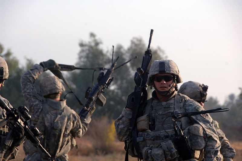U.S. Army Soldiers of 1st Battalion, 30th Infantry Regiment, 2nd Brigade Combat Team, 3rd Infantry Division, don their equipment to clear Arab Jabour, Iraq, Dec. 14, 2007. The battalion was expanding its area of operation with aid from the Concerned Local Citizens group. (U.S. Army Photo/Spc. Angelica Golindano)