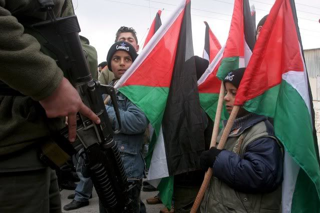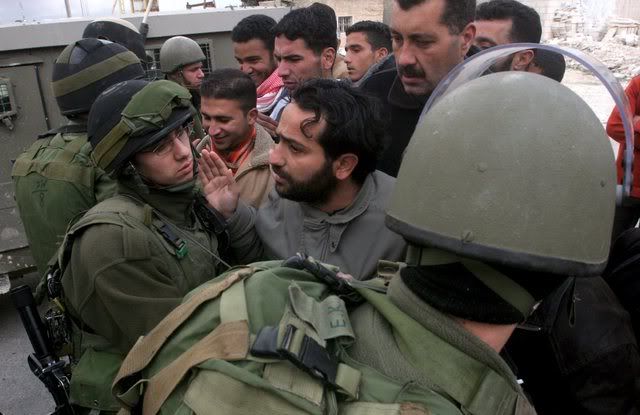 Israeli soldiers confront a demonstration by Palestinian and foreign protestors against the construction of the controversial Israeli separation barrier in the village of Umm Salamunah near the West Bank town of Bethlehem,08 February 2008. Israel says the barrier is necessary for security, while Palestinians call it a land grab