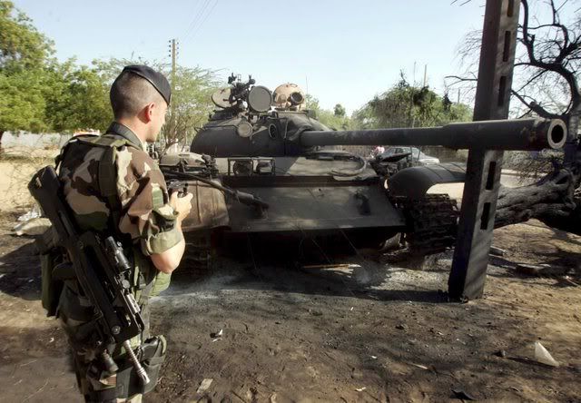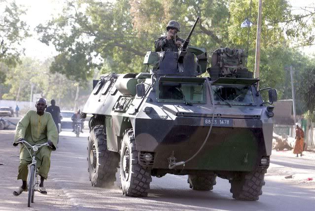A French military patrol drives in central N'Djamena, Chad, 08 February 2008, as calm returns to Chad after last week's fierce fighting between rebels and government forces loyal to Chadian President Deby. France has indicated it is willing to intervene militarily in support of the Chadian government if threaten again by rebels