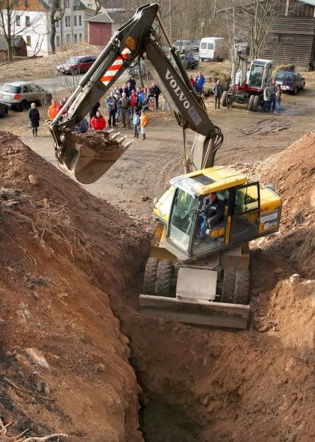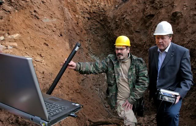 Hobby treasure hunter Christian Hanisch (L) and mayor Heinz-Peter Haustein search hollow spaces at an excavation site with a grave- and tunnel detector used to locate hidden boxes in search for Nazi loot in Deutschneudorf, Germany, 08 February 2008. The contents of the boxes, part of the legendary Amber Room or simply gold, has never been confirmed despite rumors for years that military vehicles with boxes were traced in the region during the final days of WWII.