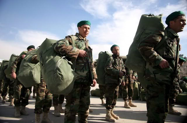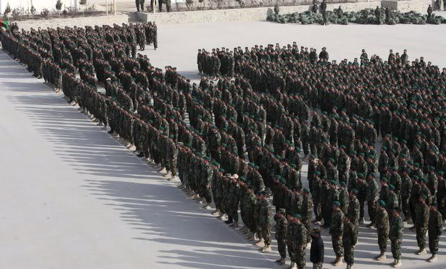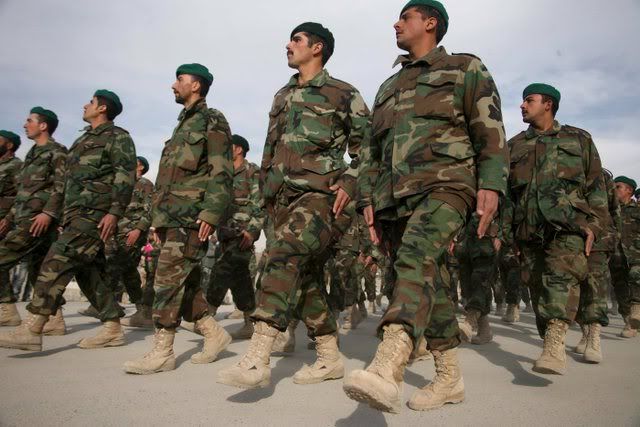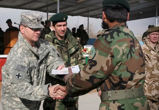 A US military official gives certificate to a soldier of ninety eighth Battalion of the Afghan national Army, during a graduation ceremony at Military Training center in Kabul Afghanistan on 22 January 2009. Some 1500 soldiers of Afghan National Army graduated on 22 January, in Kabul Afghanistan. Afghanistan is recreating the state military after more than hundred years following its total disintegration caused by foreign invasions or civil wars
