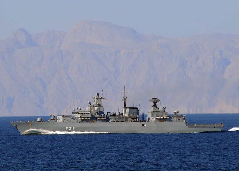 STRAITS OF HORMUZ (Jan. 16, 2008) The German frigate Mecklenburg-Vorpommern (F 218) transits the Straits of Hormuz near the guided-missile cruiser USS Vella Gulf (CG 72). Vella Gulf is deployed as part of the Iwo Jima Expeditionary Strike Group supporting maritime security operations in the U.S. 5th Fleet area of responsibility. (U.S. Navy photo by Mass Communication Specialist 2nd Class Jason R. Zalasky/Released)