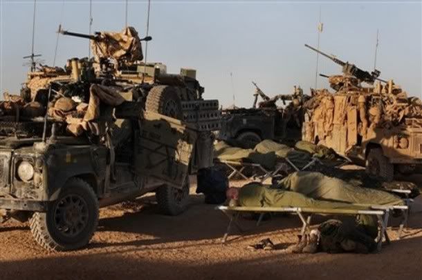 British troops from 13th Air Assault Regiment sleep next to their vehicles after arriving overnight with a resupply convoy at a forward operating base in southern Afghanistan Saturday, April 26, 2008.