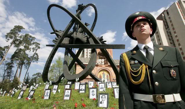 An Ukrainian soldier stands guard near of monument to people who were killed during cleaning works after Chernobyl nuclear power plant disaster during the memorial ceremony in Kiev, Ukraine, 26 April 2008. On 26 April 1986, the No 4 reactor at the Chernobyl power station blew apart. Facing nuclear disaster on an unprecedented scale, Soviet authorities tried to contain the situation by sending thousands of ill-equipped men into a radioactive maelstrom. The men barely lasted more than a few weeks, suffering lingering, painful deaths.