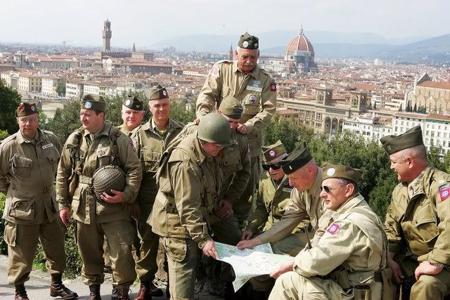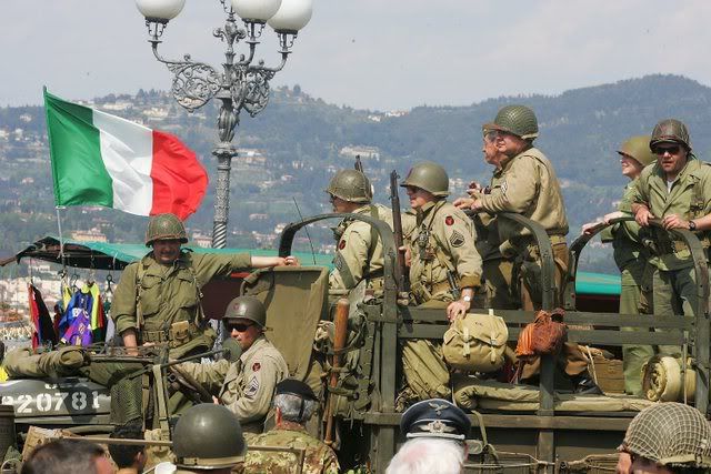 A picture made available on 26 April 2008 showing Italian men re-enacting Italy's liberation from nazism and fascism with military vehicles and historical equipment in Michelangelo square, on the hill over Florence, Italy on 25 April 2008. On 25 April, Italy marked the country's 63rd anniversary of the liberation.