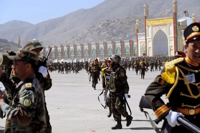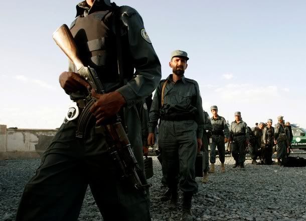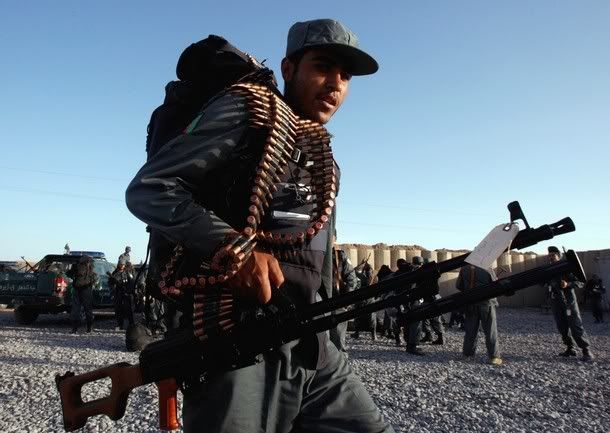 An Afghan policeman carries his weapon in Patrol Base Wilson in the Zhari district after finishing basic police training April 24, 2008.