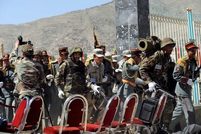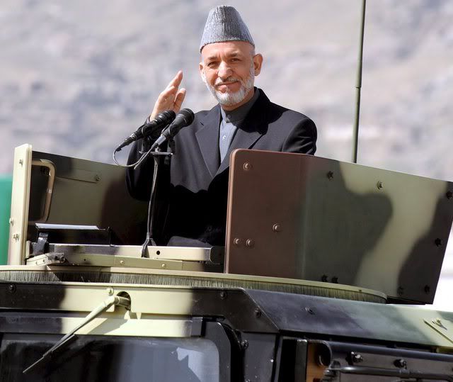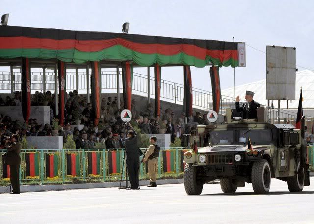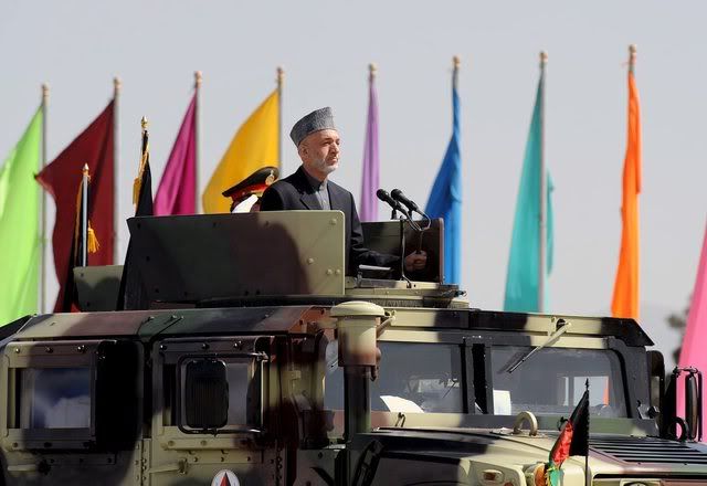 Afghanistan's President Hamid Karzai stands on a vehicle during the celebrations of 16th anniversary of Mujahideen (holy fighters) victory against the Soviet invasion, in Kabul, Afghanistan, 27 April 2008. Afghan President Hamid Karzai escaped an apparent attack against his life today during a ceremony to commemorate the victory of mujahideen over Soviet occupation, but gunfire killed one person and wounded 11 others