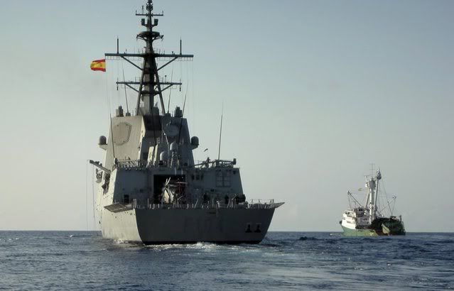 Handout photo released 27 April 2008 by Spanish Defense Ministry of Spanish Navy frigate 'Mendez Nunez' (L) protecting Spanish tuna fishing boat 'Playa de Bakio' (R) in Somalia's territorial waters as they set a course for Seychelles islands. Spanish ship, with 26 crew, was released on 26 April 2008 in Somalia waters after ten Somalian pirates hijacked the ship 20 April 2008 250 milles off Somalia's coast. Spanish First Deputy Prime Minister, Maria Teresa Fernandez de la Vega, said 26 April 2008 the Spanish crew are 'in perfect condition' as she was reporting on the release of tuna boat.