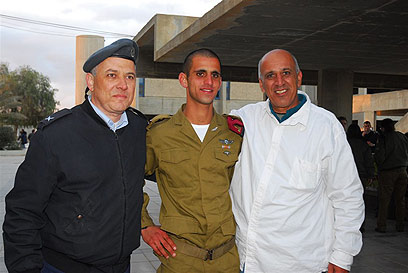 שעשוע עם אביו ועם קצין חינוך ראשי בטקס בבה"ד 1 (צילום: הרצל יוסף)