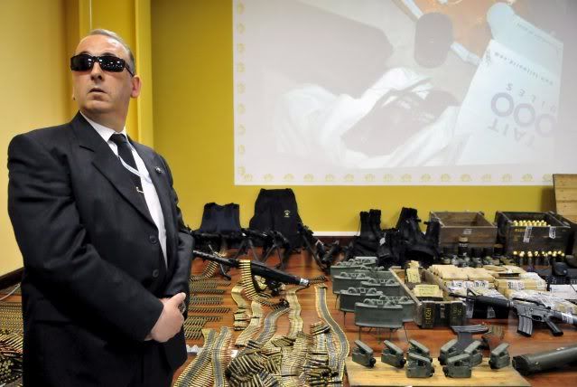Quote: Iraqi and US soldiers guard an arms cache unearthed in the past two days in the Sadr City eastern district of the capital at the Iraqi Army 11th Brigade headquarters in Baghdad on April 26 2009. The weapons and ammunition were discovered in the in Orfali and Rashad neighborhoods and shown to the press. ***** Images