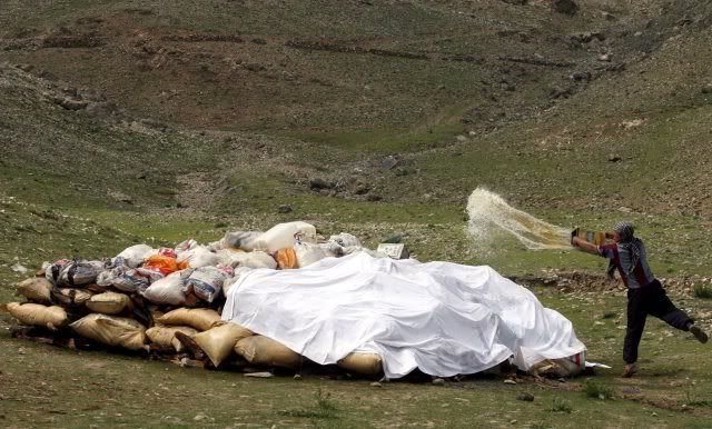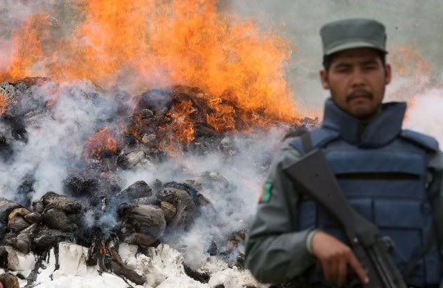 Quote: An Afghan anti-drug police man stands guard near the site where drugs are burning, unseen, during a drug burning ceremony on the outskirts of Kabul, Afghanistan, on Sunday, April 26, 2009. Afghan counter-drug officials burned 6.5 tons of drugs in a raging bonfire Sunday that they said symbolized recent successes in Afghanistan's fight against opium poppies and heroin. AP Photo