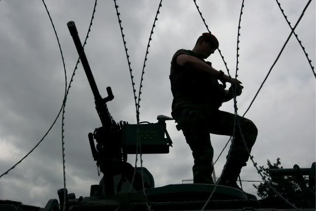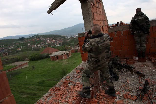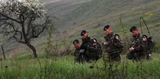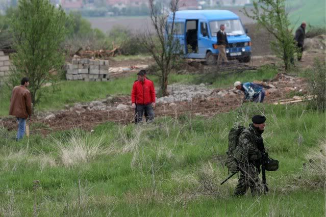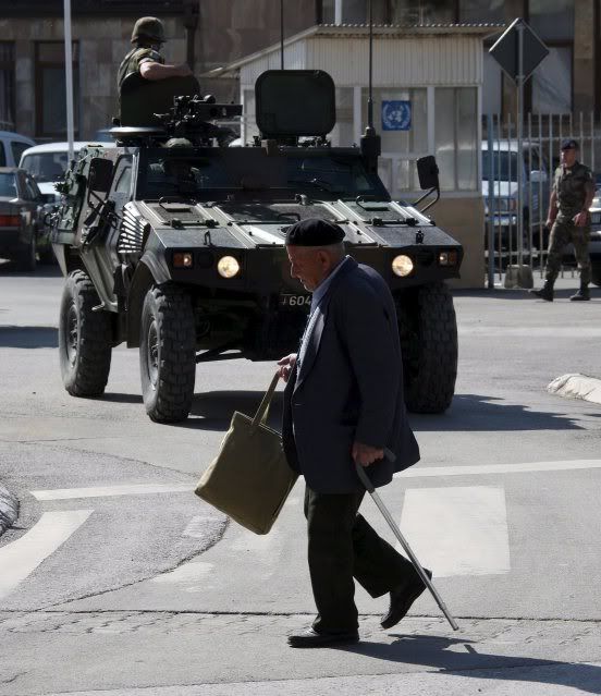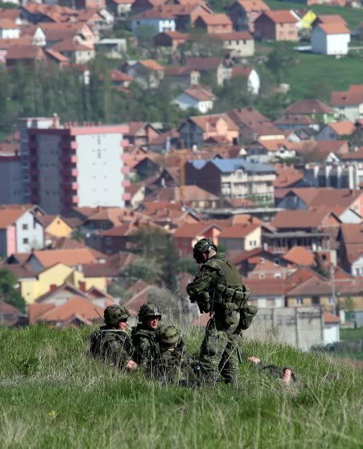 NATO soldiers patrol in Mitrovica, Kosovo, 28 April 2009. A few hundred Serbs held a protest against ethnic Albanians who are rebuilding their destroyed houses following the 1998 -1999 conflict between Yugoslav police forces, Yugoslav paramilitaries, and the Kosovar Albanian paramilitaries. in northern Mitrovica, Kosovo, on 28 April 2009.
