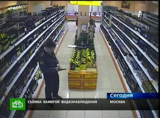 A TV grab from Russian NTV channel taken 27 April 2009 shows police officer Denis Yevsyukov reloading his pistol in the supermarket Ostrov early Monday in Moscow, Russia, on 27 April 2009. Yevsyukov killed at least three people on Monday during a shooting spree in a Moscow supermarket after a family row at his birthday party, officials said
