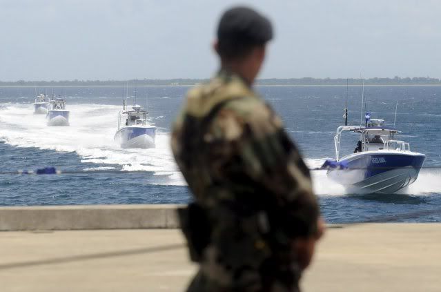 Three of four speedboats given by the United States of America to Honduras to fight against drug trafficking make manoeuvres in Puerto Castilla, Honduras, 27 April 2009