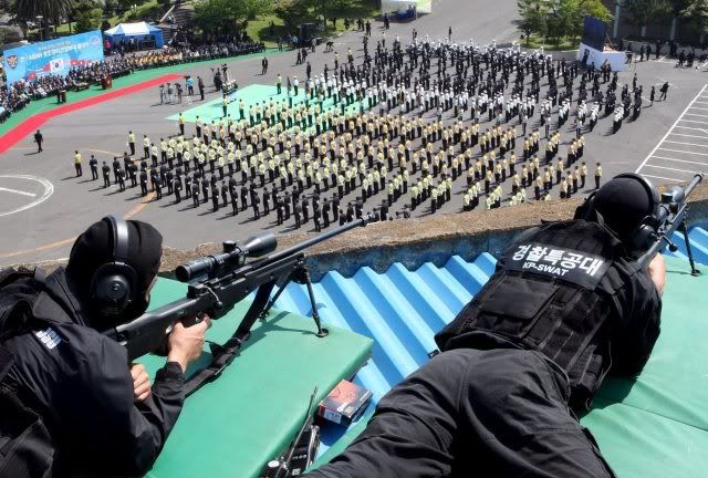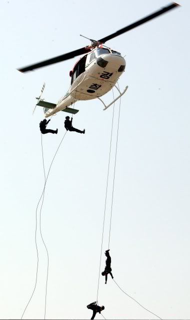 Police commandos descend from a helicopter as part of a demonstration of anti-terrorist measures 28 April 2009 during a launching ceremony for a special anti-terrorism unit assigned to the South Korea-ASEAN summit slated for June in the southern resort island of Jeju