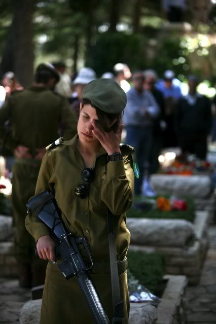 An Israeli female soldier wipes tears from her face, during the Memorial Day to commemorates fallen soldiers at a military cemetery in Jerusalem, Israel, 28 April 2009. Israelis stood to attention for two minutes Tuesday morning, as sirens wailed across the country to commemorate the more than 22,000 soldiers and civilians killed in wars or attacks since Israel's foundation and the years leading up to it