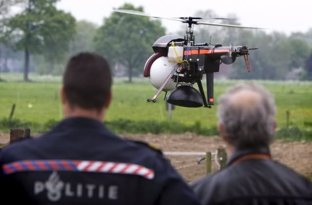 Dutch police watch an unmanned helicopter taking off to localize cannabis fields and drug smugglers in Silvolde, eastern Netherlands 28 April 2009. Dutch police used for the first time a so-called 'Cannachopper' (from 'cannabis' and 'chopper') with mounted devices to detect illicit cannabis crops