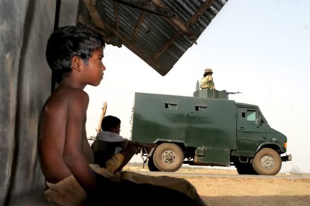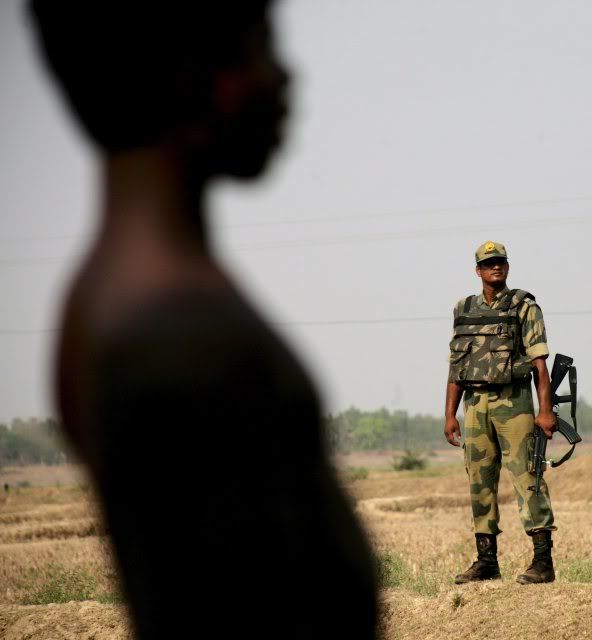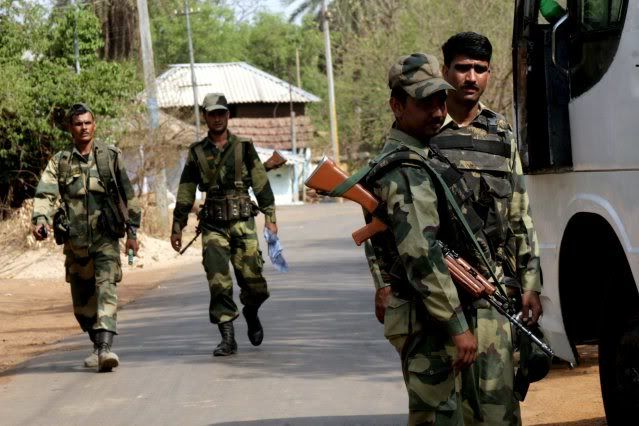 A boy stands near security personnel before the third phase of polling in Lalgdar village, Midnapore, 280 Km west of Calcutta, India on 28 April 2009. On 30 April millions of people cast their vote across India in third phase of parliamentary elections that is expected to lead to a verdict more splintered than five years ago. The world's largest exercise in democracy, India's general election, will take weeks to complete and involve hundreds of millions of voters. Some 714 million voters are eligible to cast ballots, with almost four million officials taking part. At the end of the second phase, polls would be completed to 265 seats, just seven short of the magic number that parties need to form a government in the 545-member house