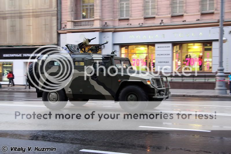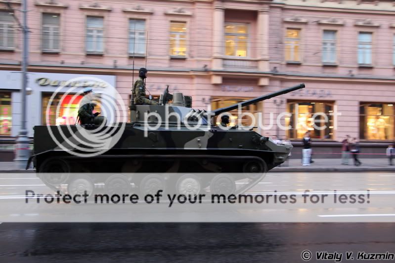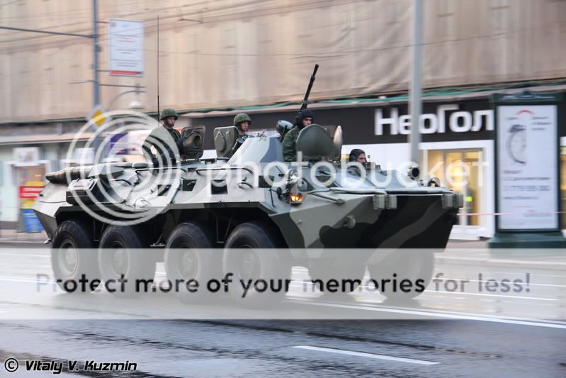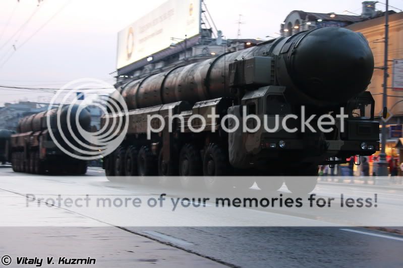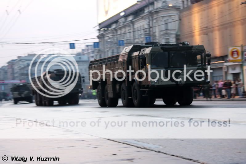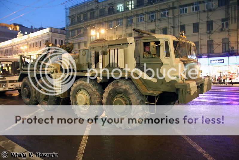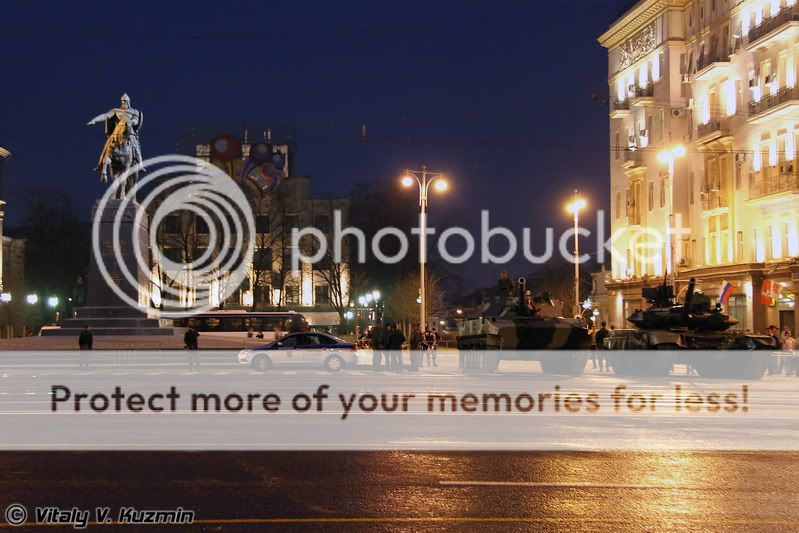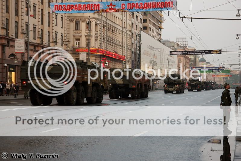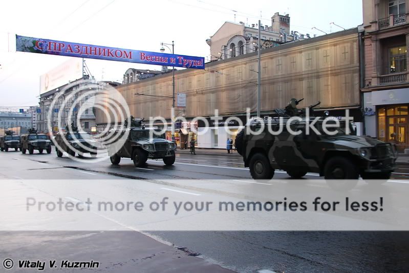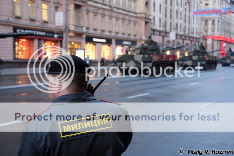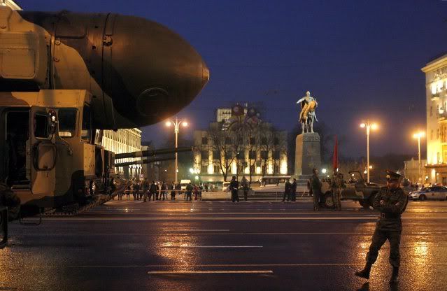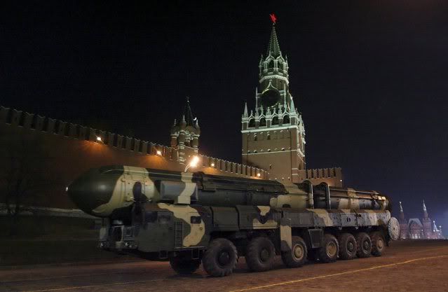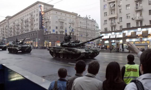 Russian military vehicles drive along Tverskaya street during the rehearsal of the Victory Day parade in Moscow, Russia 28 April 2009. Victory Day is held annually on 09 May and marks the defeat of Nazi Germany in 1945. In 2008 Russian tanks and intercontinental missile launchers were paraded through Moscow for the first time since the collapse of the USSR