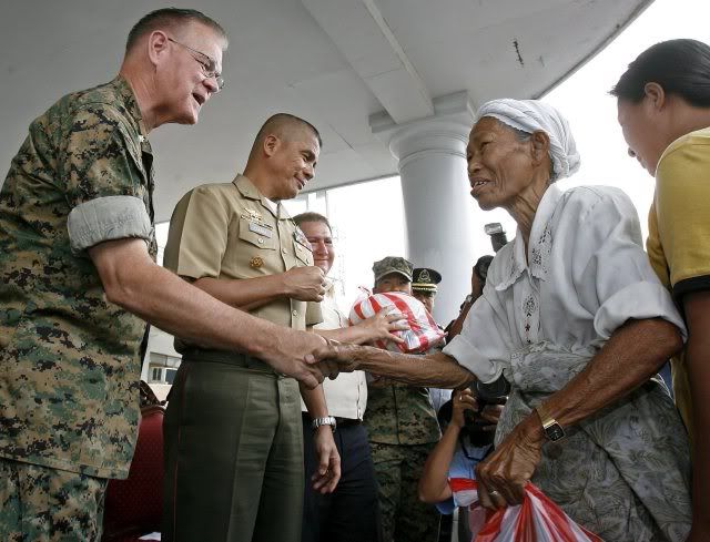 US Navy Commander Ronald Tomlin (L) shakes the hand of a Filipino woman during a gift-giving ceremony at the Philippine Marines Headquarters in Taguig City, southern Manila, Philippines on 29 April 2009. US soldiers are conducting humanitarian and charitable programs in the country as part of the US-RP joint military exercise, dubbed 'Balikatan 2009.'