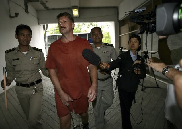 Alleged Russian international arms dealer, Viktor Bout, (2-L) walks past the media as he arrives at the criminal court, in Bangkok, Thailand, 29 April 2009. Viktor Bout, dubbed the ' Merchant of Death ', and allegedly one of the world's most notorious weapons traffickers, was apprehended in Bangkok in 06 March 2008 on suspicion of illegal arms trade. The United States demands his transfer and lifetime imprisonment