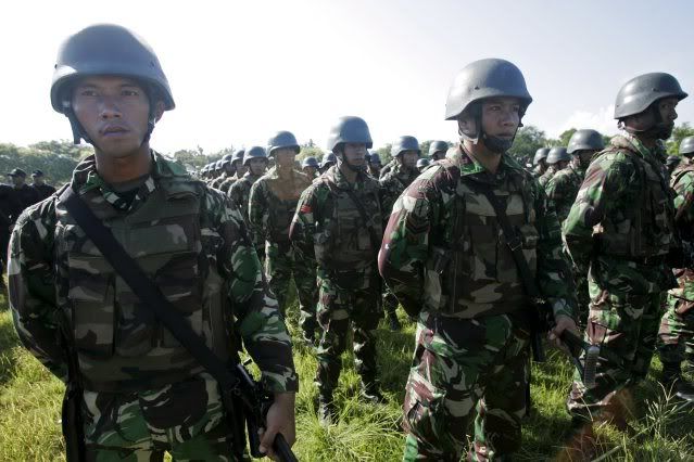 Indonesian soldiers line up during security preparations for the upcoming Asian Development Bank (ADB) governors meeting in Nusadua, Bali, Indonesia, 29 April 2009. The 42nd ADB governors meeting will take place on 2-5 May 2009, will discuss three main issues including the global economic crisis, climate change and regional economic integration