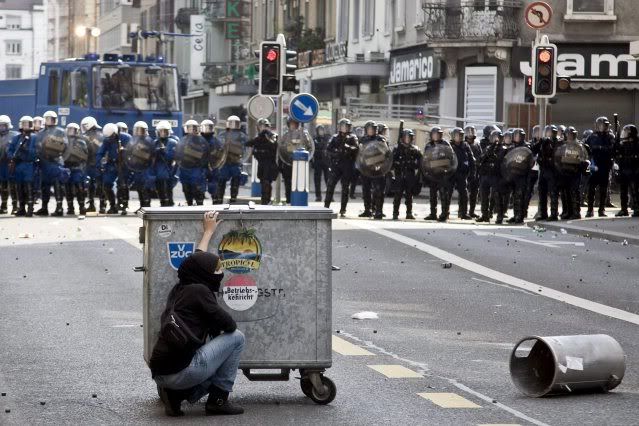 Protestors battle police during a May Day demonstration in Zurich, Switzerland, Friday May 1, 2009. Hundreds of thousands of European workers feeling the pinch of the economic crisis rallied at May Day protests from Moscow to Berlin to Istanbul. Violence and clashes between police and angry protesters disrupted some events, but overall participation fell short of what many countries' unions had hoped for on May Day, a public holiday in many countries that has long celebrated the social and economic achievements of labor movements.
