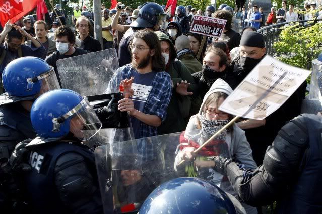 Protesters clash with police as they demand for better employment rights and increase in salaries during joint May Day rallies along the streets of Manila May 1, 2009 amid the global economic slowdown that has displaced millions of workers around the world. The number of jobless Filipinos was 180,000 higher in January than a year earlier, pushing the