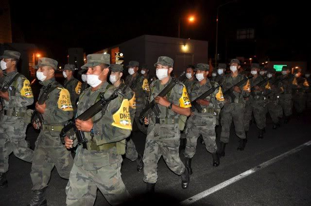 Georgian special forces soldiers keep watch during a rally by opposition protestors outside Georgia's state run Channel One television offices in Tbilisi on May 1, 2009. A few dozen activists, opposed to President Mikheil Saakashvili, gathered to call on Channel One employees to quit their jobs. (AFP / ***** Images)