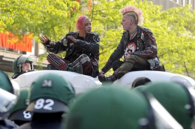 Riot police clear a street after people threw stones and empty bottles at police officers during an ancient pagan celebration called Walpurgis Night at the vigil of May Day demonstration in Berlin's district of Friedrichshain, April 30, 2009. (Reuters)