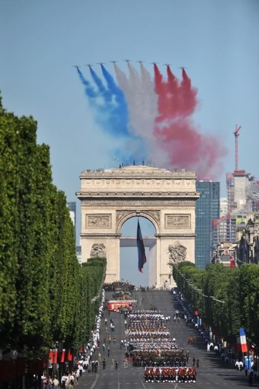 Nine Alpha Jets from the French Air Force's Patrouille de France, or French Acrobatic Patrol, fly in an arrow formation over the Arc de Triomphe monument during the Bastille Day military parade on the Champs Elysees avenue in Paris, Tuesday July 14, 2009.