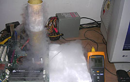 חנקן נוזלי, לאילו מאיתנו ששכחו את שיעורי הכימיה שלהם, הוא הדבר הכי קר שהאדם מכיר. אם מישהו מכם עבר פעם הסרת שומה או נקודת חן, הוא וודאי זוכר את צריבת הקור המאוד לא נעימה של החנקן הנוזלי, אשר הטמפרטורה שלו עומדת על מינוס 196 מעלות צלזיוס. לשם הדגמה, כאשר מטפטפים חנקן נוזלי על פרח טרי, הוא קופא מייד, נופל על הרצפה ונשבר לרסיסים. אז אליאור, ועוד כל מיני אנשים בעולם, החליטו שיהיה ממש מגניב לקרר את המחשב שלהם עם החומר הזה. נשמע הזוי לחלוטין, אבל אחרי שראיתי את התמונות, אני חייב לציין שזה מצחיק לאללה.
