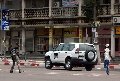 UN troops in an armored medical vehicle drive through the streets of Kinshasa, Congo, Monday, Aug. 21, 2006. Battles between forces loyal to Congolese President Joseph Kabila and those of his main campaign rival Jean-Pierre Bemba broke out for a second day Monday, with heavy gunfire outside Bemba's home as he met top diplomats inside, officials said.(AP Photo/John Bompeng)
