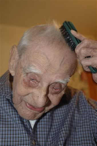 Emiliano Mercado Del Toro combs his hair at his home in Isabela, Puerto Rico, Monday, Aug. 21, 2006. Mercado, born on Aug. 21, 1891, and certified the oldest man in the world by the Guinness Book of World Records is also the oldest living veteran. He didn't see action because, called up in 1918, he was two months into U.S. Army training when World War I ended Nov. 11, 1918. He was married three times but never had children. (AP Photo/Javier Gonzalez)
