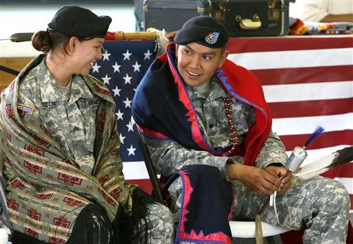 Army Sgt. Chrystal Yazzie, 23, and her husband Spc. Alric Yazzie, 23, talk at the gourd dance held in their honor Sunday, Aug. 20, 2006 at the Nenahnezad Chapter House, in Nenahnezad, N.M. The Army couple returned home from tours in Iraq on Saturday. (AP Photo/The Daily Times, Lucas Coshenet)