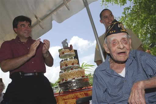 Emiliano Mercado Del Toro participates in his 115th birthday party, at Del Toro's home in Isabela, Puerto Rico, Monday, Aug. 21, 2006. Isabela's Mayor, Carlos Delgado, left, sings the traditional birthday song to Del Toro, along with Del Toro'sgreat great nephew Arturo Vargas. Mercado, born on Aug. 21, 1891 and certified the oldest man in the world by the Guinness Book of World Records is also the oldest living veteran. He didn't see action because, called up in 1918, he was two months into U.S. Army training when World War I ended Nov. 11, 1918. He was married three times but never had children. (AP Photo/Javier Gonzalez)