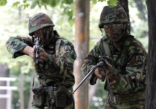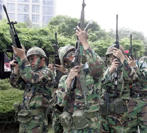 South Korean soldiers adjust their weapons during an annual joint military exercises named Ulchi Focus Lens in Seoul, Tuesday, Aug. 22, 2006. North Korea lashed out Tuesday at ongoing U.S.-South Korean military drills and warned it could take retaliatory action amid renewed concern that the communist nation may be preparing to test a nuclear bomb. (AP Photo/ Lee Jin-man)