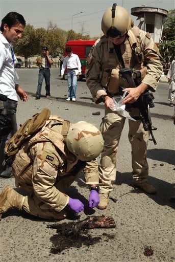 EDITORS NOTE GRAPHIC CONTENT ** U.S. Navy EOD check a piece of a human body after a bomb blast near the U.S embassy in Kabul, Afghanistan on Friday, Sept. 8, 2006. A suicide bomber sparked a massive blast Friday near the U.S. Embassy in Kabul, tearing apart a military vehicle and killing at least three people, including two U.S.-led coalition soldiers, witnesses said and police said. (AP Photo/Musadeq Sadeq)