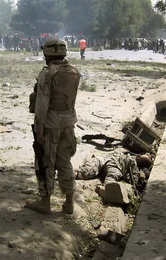 EDITORS NOTE: GRAPHIC CONTENT RIP** A U.S soldier stands near a laid U.S soldier on the ground, right, at the bomb blast spot near the U.S Embassy in Kabul, Afghanistan on Friday, Sept. 8, 2006. A massive suicide car bomb struck a convoy of U.S. military vehicles in Kabul on Friday, killing at least 10 people, including two American soldiers, and wounding 17 others, officials and witnesses said. (AP Photo/Paul Garwood)