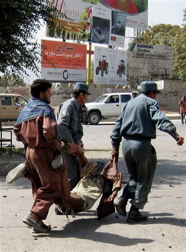 Graphic Image, RIP** Afghans carry a wounded man at the bomb blast spot near the U.S Embassy in Kabul, Afghanistan on Friday, Sept. 8, 2006. A massive suicide car bomb struck a convoy of U.S. military vehicles in Kabul on Friday, killing at least 10 people, including two American soldiers, and wounding 17 others, officials and witnesses said. (AP Photo/Paul Garwood)