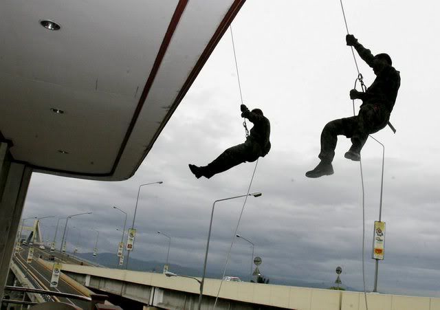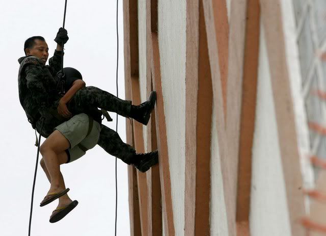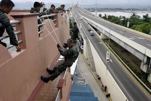 epa00899272 High above the streets of Cebu, members of the Police Special Action Force (SAF) participate in hostage rescue drill as part of security preparations for the 12th ASEAN Summit in Cebu central, Philippines ,on Wednesday, 10 January 2007. Security measures are all in place for the 12th Summit of the Association of Southeast Asian Nations which begins today and continues to 15th Jan EPA/DENNIS M. SABANGAN