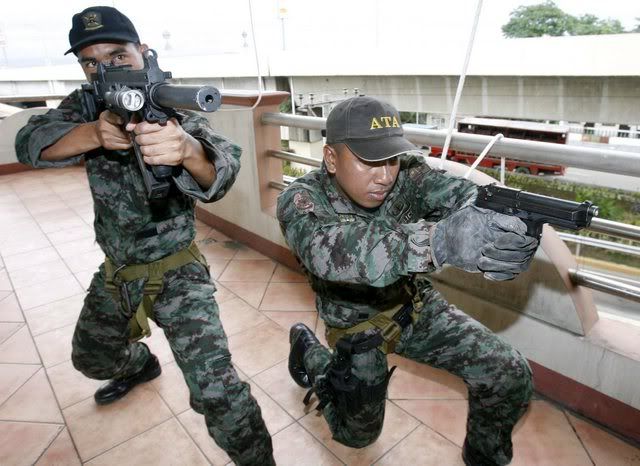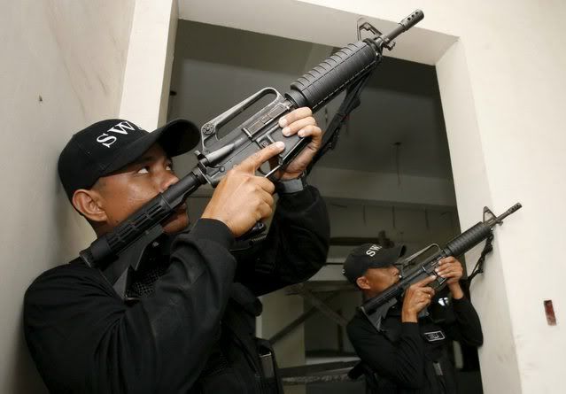epa00899225 Elite Police unit from SWAT (Special Weapons and Tactics) Team manuever during the security drill in preparation for the upcoming 12th ASEAN Summit in Cebu central, Philippines on Wednesday, 10 January 2007. Security measures are all in place for the 12th Summit of the Association of Southeast Asian Nations (ASEAN) here on January 1015, Philippine security officials said . EPA/DENNIS M. SABANGAN