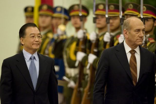 epa00899258 Israeli Prime Minister Ehud Olmert (right) is accompanied by Chinese Premier Wen Jiabao at a welcoming ceremony at the Great Hall of the People in Beijing Wednesday 10 January 2007. Olmert is on a three day visit to China aimed primarily at improving bilateral ties and seeking Chinas support in efforts to counter the threat of Iranian nuclear weapons development. EPA/ADRIAN BRADSHAW