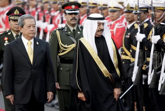 epa00899339 Thai Prime Minister Surayud Chulanont (L) and Bahrain Prime Minister Shaikh Khalifa bin Salman Al Khalifa (R) review the guard of honour during the welcoming ceremony at Government House in Bangkok, Thailand, Wednesday 10 January 2007. The Bahraini prime minister is in Thailand for a threeday official visit. EPA/SUKREE SUKPLANG POOL