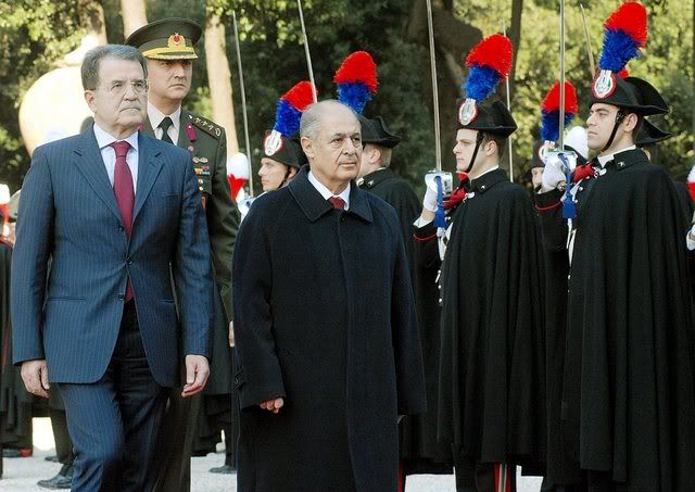 epa00899431 Italy Premier Romano Prodi (escorts) Turkey President Ahmer Necdet Sezer past a guard of honour during welcoming ceremonies at Villa Pamphili in Rome Wednesday 10 January 2007 ahead of a round of talks EPA/MAURIZIO BRAMBATTI