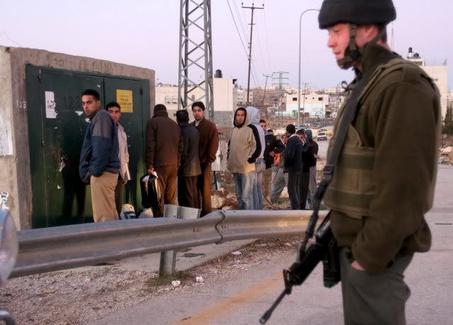 epa00899490 An Israeli Border Policeman stands guard as young Palestinians are undergoing a police control in Bait Anoon near the West bank city of Hebron, Wednesday, 10 January 2007. EPA/ABED AL HAFIZ HASHLAMOUN