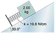 בול שמסתו 2.0kg ממוקם על שיפוע חלק הנטוי בזווית 30.0°, ונוגע בקפיץ הממוקם כמתואר באיור.